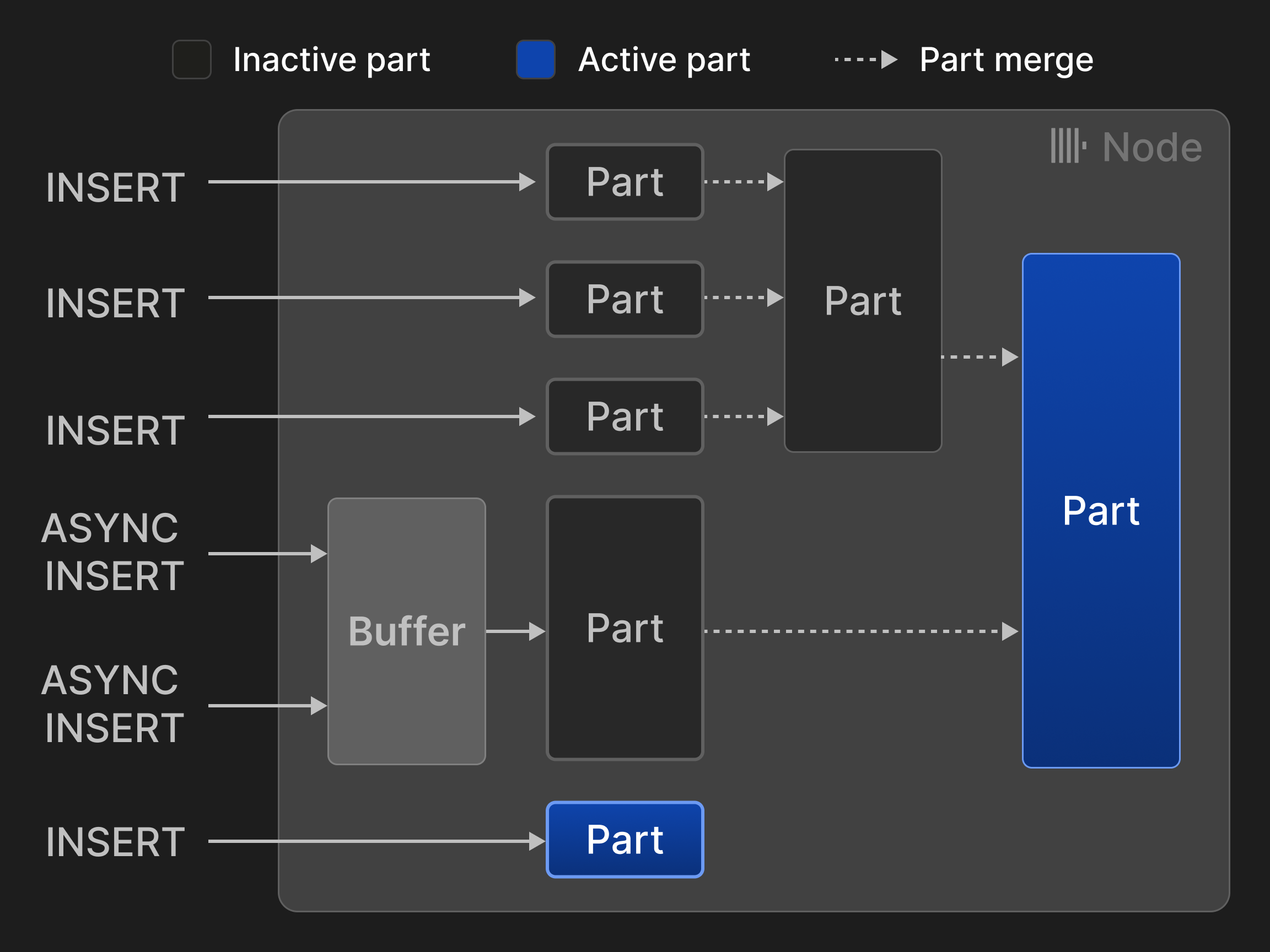 Рисунок 3 иллюстрирует четыре синхронные и две асинхронные вставки в таблицу движка MergeTree*. Два слияния сократили количество активных частей с первоначальных пяти до двух.